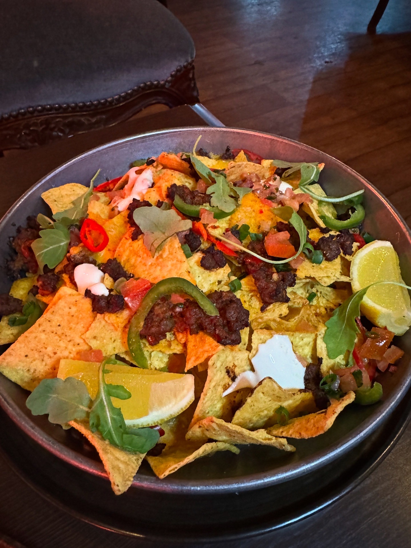 Po to užsimanėm užkąst, ir gerai, kad jie turi ne tik gėrimus, bet didelį maisto pasirinkimą. Ėmėm nachos su krūva mėsos: